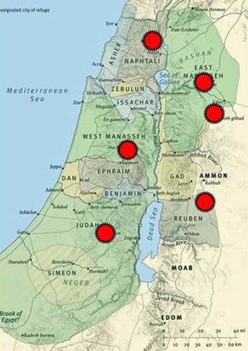 BUT, God had not finished with the instructions of preparations for life in the new land yet! “Speak to the children of Israel saying ‘ Appoint for yourselves cities of refuge’”. In that statement, God clearly illustrated His intent that life in the promised land for the people He called “His special treasure”, was to be very different from “the ways of the world”. When Moses was still alive (Numbers 35:6-34), God had given him instructions about these cities. The map here shows the location of them. SIX in all. They were spaced around the community in such a manner that no-one had more than about 30 miles to travel from anywhere in the land to arrive in the one closest to them. God wanted them to live together in the land in an orderly and safe manner, but recognised that there were occasions when someone might accidentally cause the death of another. In those days, and in some societies, even today, custom has it that the family of the deceased seeks to extract a ‘blood price’, in the form of ‘revenge’ killing, of the person who caused that death. It is worthy of note that the Hebrew expression is “ga’al haddam”, which properly translates as “blood redeemer”. That has more a connotation of ‘making right’. But it makes no allowance for accidental death (Deuteronomy 19:4-7), so in the promised land, if that person could get into one of these cities of refuge, his/her life would be safe from such ‘revenge’. Upon arrival at one of these cities the person seeking refuge would declare the circumstance to the elders of the city of refuge, and would be given lodging and safety for a period of time. Either until that person was given the opportunity to stand in impartial trial before the congregation in judgment of the case, or until the death of the one occupying the position of High Priest in that day. Why? The best explanation I was able to discover was because of the High Priestly, God ordained, authority in his sacrificial, atonement, duties on Yom Kippur each year. An authority which is deemed to remain for the next twelve months, or until his death before that time expired. It is also symbolic of the sacrificial death, and the redemptive features, of our Saviour Yeshua’s death.